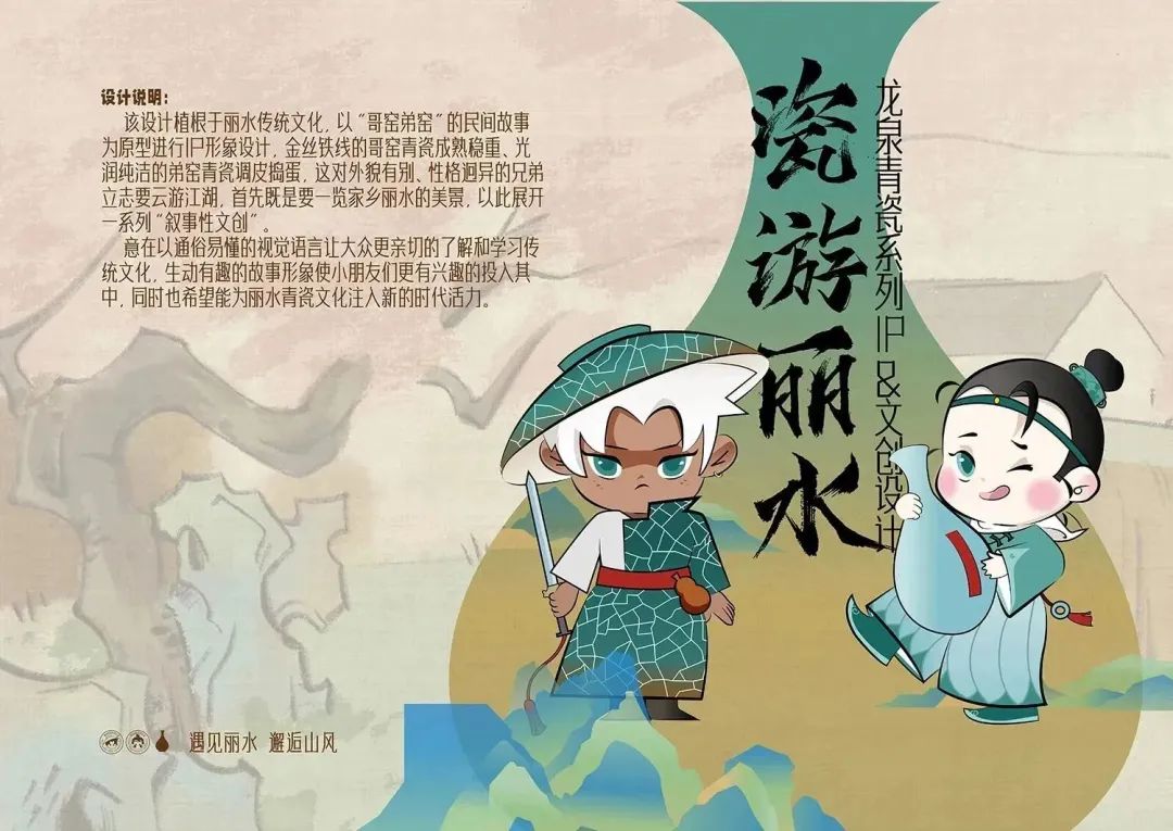 該設(shè)計植根于麗水傳統(tǒng)文化,以“哥窯弟窯”的民間故事為原型進行IP形象設(shè)計,金絲鐵線的哥窯青瓷成熟穩(wěn)重、光潤純潔的弟窯青瓷調(diào)皮搗蛋,這對外貌有別、性格迥異的兄弟立志要云游江湖,首先既是要一覽家鄉(xiāng)麗水的美景,以此展開一系列“敘事性文創(chuàng)”。